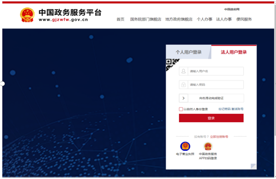 注:如企業(yè)非中國大陸身份證號法人可選擇也可登錄中國政務(wù)服務(wù)平臺www.gjzwfw.gov.cn進行注冊,選擇【法人用戶登錄】,點擊【立即注冊賬號】。