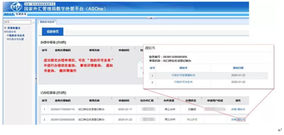 成功提交辦理申請后,企業(yè)可在“行政許可”-“我的許可業(yè)務(wù)”中進行辦理狀態(tài)查詢、事項詳情查詢、通知書查詢、撤回等操作。申請?zhí)峤缓蟀l(fā)現(xiàn)要素填寫錯誤的,請撤回申請,修改后重新提交。